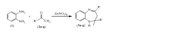1,5-benzodiazepines are synthesized by the condensation of o-phenylenediamine and various ketones in the presence of Zr(NO3)4 under solvent free condition. The method offers mild reaction conditions, less reaction time, easy workup, high yields, easy product isolation, selectivity of the reaction and reusability of catalyst.